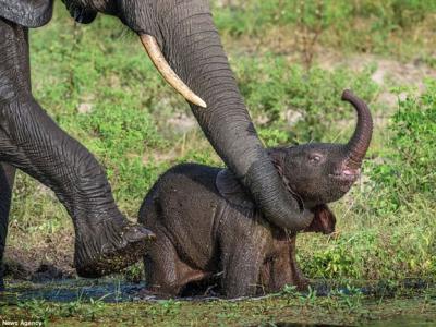非洲博茨瓦纳小象被困水洼 大象妈妈赶来