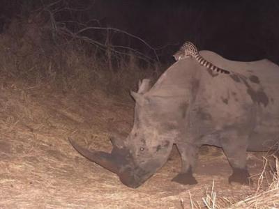 最近在南非拍到的新相机陷阱影片中,有一只麝猫坐在一只黑犀牛的背上。 (神秘的...