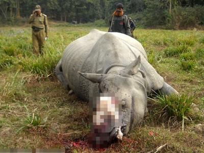 印度阿萨姆邦卡齐兰加国家公园犀牛遭锯角