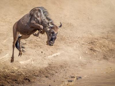 在一年一度的穿越马拉河大迁徙中,这只角马从岸边起跳,欲飞渡马拉河。 为了从...