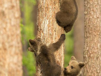 芬兰森林棕熊幼崽趁熊妈打盹顽皮爬树