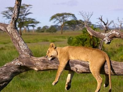 坦桑尼亚塞伦盖蒂国家公园一头母狮爬上大树悠闲的酣睡 (神秘的地球报...