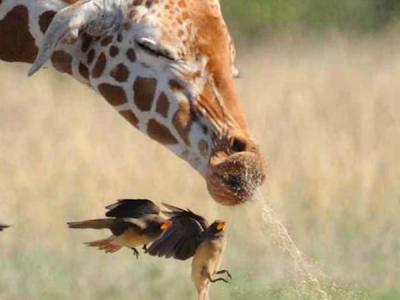 啄木鸟险被喝水的长颈鹿吸入口中