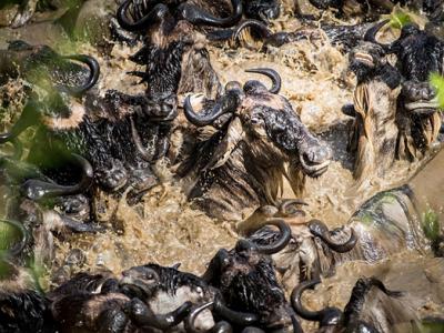 肯尼亚数百万角马壮观地横跨马拉河