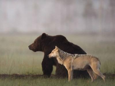 芬兰北部郊野一头雌性灰狼同一头雄性棕熊成好友 芬兰北部郊野一头雌性灰狼同一...