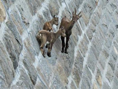 意大利一群野山羊爬陡峭大坝舔食矿物质