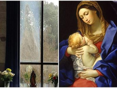 这窗户影像(左图)与一般画作上的圣母,有几分相似。 “圣母”前有民众摆放的...