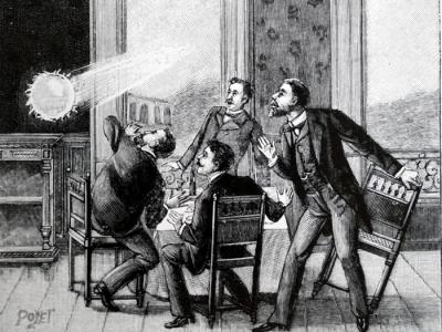 这幅法国插图描绘的是球状闪电从窗户飞进房间,历史上有许多这...