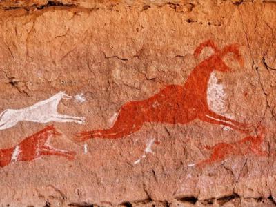 在利比亚阿卡库斯山(Acacus Mountains)里的岩画上,一群行动...