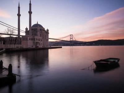 黎明为土耳其伊斯坦堡的奥塔科伊清真寺洒上玫瑰色的光辉。 附...