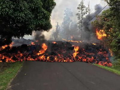 基劳厄亚火山爆发之后,熔岩流过夏威夷大岛上的马卡梅伊街上。...
