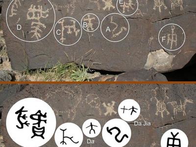 在美洲岩石上出现的符号,十分近似中国古代象形文字。 罗斯坎普声称,这些在新...