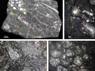 礁灰岩的抛光面和薄片. A) 珊瑚-串管海绵-微生物綁结岩抛光面. B-D) 抛光面中不同...