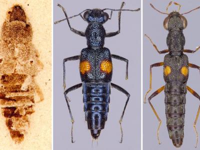 化石突眼隐翅虫Eocenostenus(左)和现生束毛隐翅虫属(中)、突眼隐翅虫属(右)...