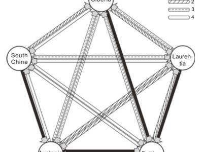 示埃隆期全球五大板块腕足动物古地理关系紧密程度排序(从1-4关系递减) 埃隆...