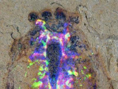这是Alalcomenaeus化石标本头部的特写,显微镜技术叠加色彩揭示该化石标本化学元...