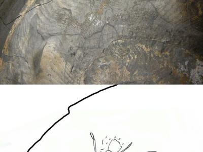 镰菊石化石中的龙虾及素描图 镰菊石化石原貌及素描图 能揭示化石生物行为的直...