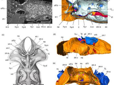 浙江曙鱼的生态复原及脑内颅的三维重建(Brian Choo 绘制) 一百年来,颌的起源...