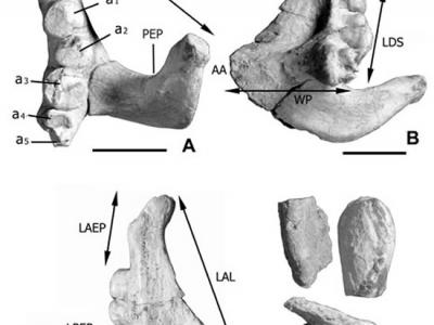 一块哺乳动物头骨化石,牙齿窝里的沉积物,原来是史前蜜蜂筑的巢穴。图片来源:uux...