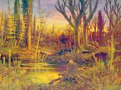 泥盆纪(约4亿年前)陆地景观复原图 一种泥盆纪的鱼类Dunkleosteus terreli复...