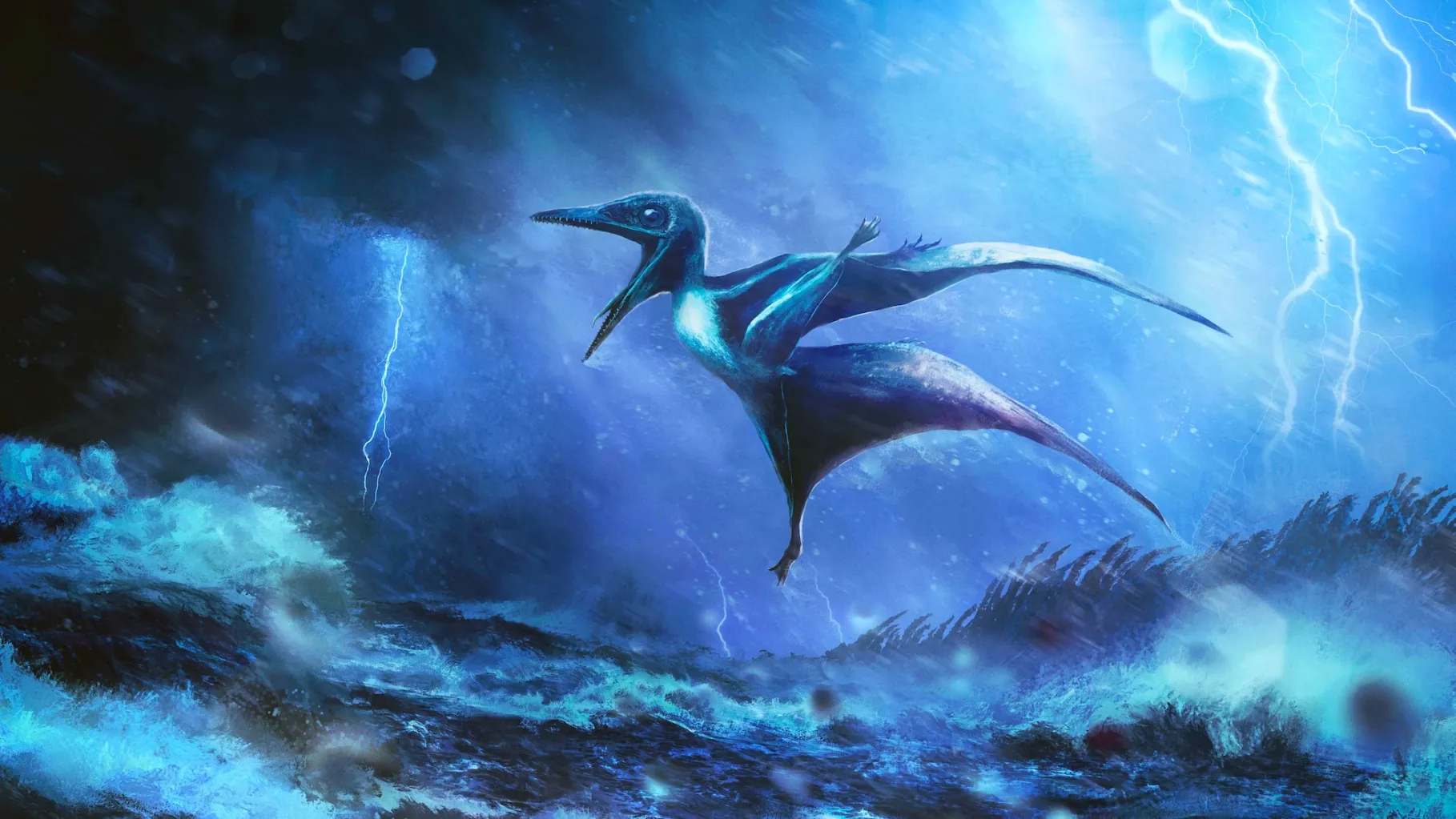 受化石发现的启发,一位艺术家对一只小翼手龙幼崽在肆虐的热带风暴中挣扎的印象。&...