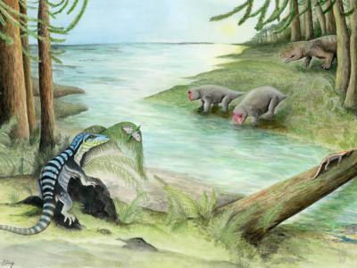 插画中一群无壳的罗氏祖龟(Pappochelys rosinae)正在探索一...
