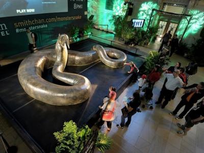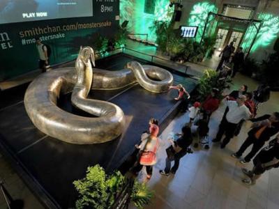 博物馆展示泰坦巨蟒模型,参观者对于它的庞大身躯感到吃惊。 泰坦巨蟒可以一口...