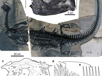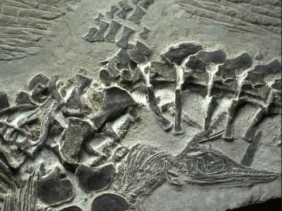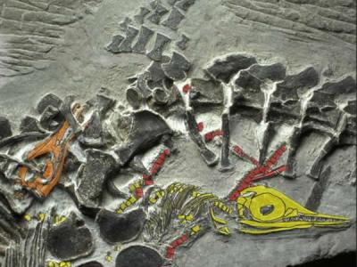 这具化石被认为是在生育过程中丧生的最早的远古海洋爬行动物的一个鲜活实例。它的...
