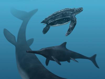 棱皮海龟、鱼龙和沧龙身上的配色方案与现代海洋生物非常类似 (神秘的地球)据中...