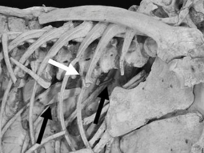 驰龙肋骨下的一小片翼龙骨骼残骸 驰龙肋骨下的一小片翼龙骨骼残骸 近日,科学...
