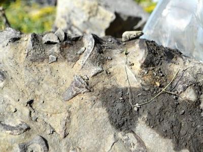 岩石中露出的蛇颈龙椎骨化石 位于美国费尔班克斯(Fairbanks)北部的阿拉斯加大...