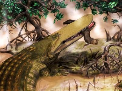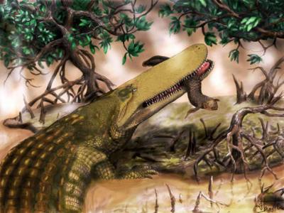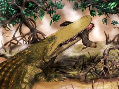 艺术概念图,展现了美国科学家发现的已知最为古老的鳄鱼。这种鳄鱼颚部较小,主要...