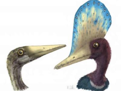 与性别有关的达尔文翼龙特征,雌性无头骨脊(左),雄性有头骨脊(右)(复原图由...