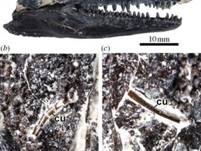 图片a展示的是一个正在被研究的化石骷髅。这些化石和其他爬行动物化石目前都保存...