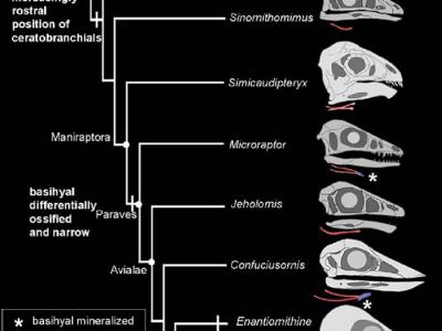 图为主龙类的舌骨演化。图中可以发现了翼龙出现了和鸟类趋同的...