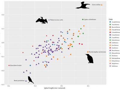 现生鸟类在由胸骨龙骨突长度和髂骨长度所确定的形态...