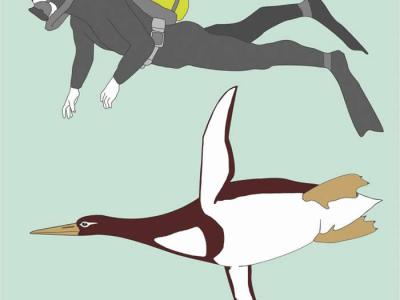 这幅插画将碧丝巨鸟企鹅重现,并和人类潜水员做比较。 COURTE...