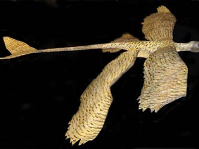 一个生有4个翅膀的恐龙的泡沫塑料模型揭示了它如何在树林中滑翔。 鸟类究竟是如...