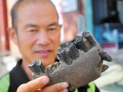 哈尔滨市民拾到两万年前王氏水牛化石 24日,哈尔滨市香坊区居民史作玺拾到一块巴...