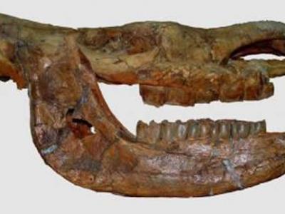 Coelodonta的头骨和颚的正模标本的数码混合照片 一项新的研究提示,严寒霜冻的西...
