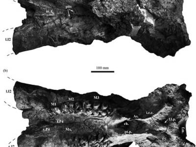 广河豕脊齿象(新种)头骨(IVPP V17685) (a) 背面视; (b) 腹面视. 注释: As., 翼蝶...