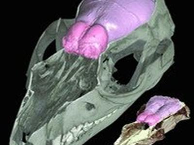 嗅球(粉色)在哺乳动物大脑中的扩张(图片提供:Matt Colbert,得克萨斯大学) 在恐...