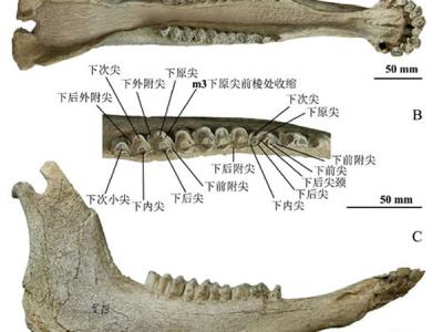 龙担短角丽牛(Leptobos brevicornis)下颌 (李刈昆供图) 短角丽牛(Leptob...