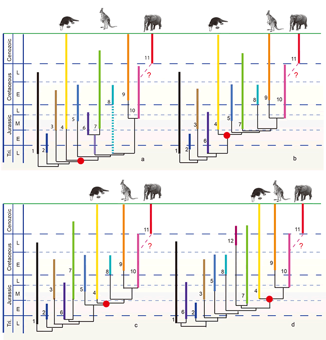哺乳动物系统发育的不同假说。a–c 四种不同的哺乳动物系统发育假说。图中红点代...