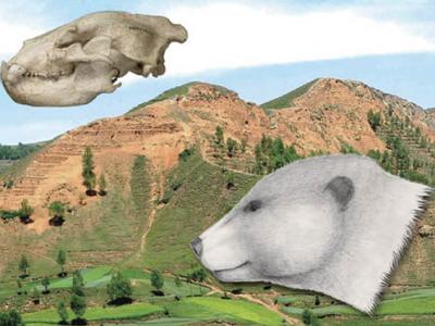 戴氏祖熊头骨化石及其头部复原(史勤勤绘),背景为临夏盆地晚中新世的三趾马红土...