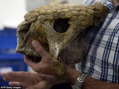 考古学家阿什卡尼亚-林康正在展示委内瑞拉境内挖掘的一个雕齿兽头骨 考古研究...