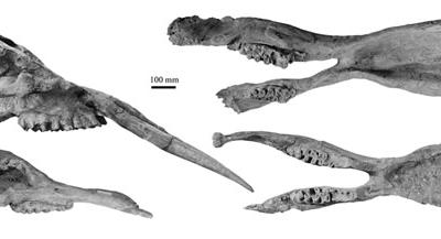 临夏盆地的葛氏铲齿象(Platybelodon grangeri)A, 雄性头骨; B, 雌性头骨; C, 雄...