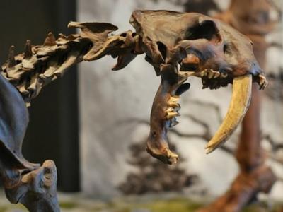 美国犹他州自然历史博物馆的一个剑齿虎标本,科学家最新研究称剑齿虎像吸血鬼一样...