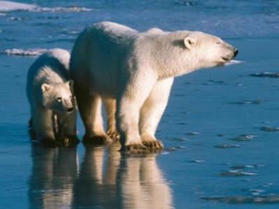 在加拿大丘吉尔角附近的冰封湖面上的雌性北极熊和她的幼熊 据一项新的遗传学分析...