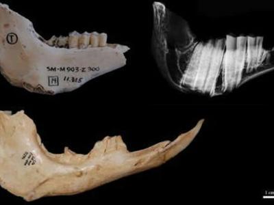 左上显示洞山羊的高齿冠,右上为相应的X射线图像,左下为古老的无珐琅质的被磨损...